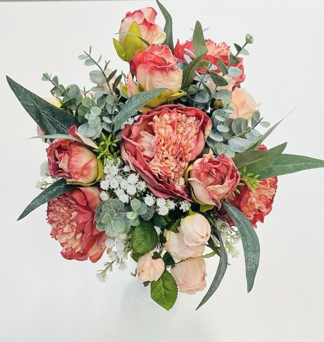 A rustic and elegant bouquet featuring fully open mocha-toned peonies paired with creamy ivory roses, accented with lush greenery and delicate white filler flowers, tied together with a soft white ribbon — perfect for a romantic woodland or vintage-inspired wedding