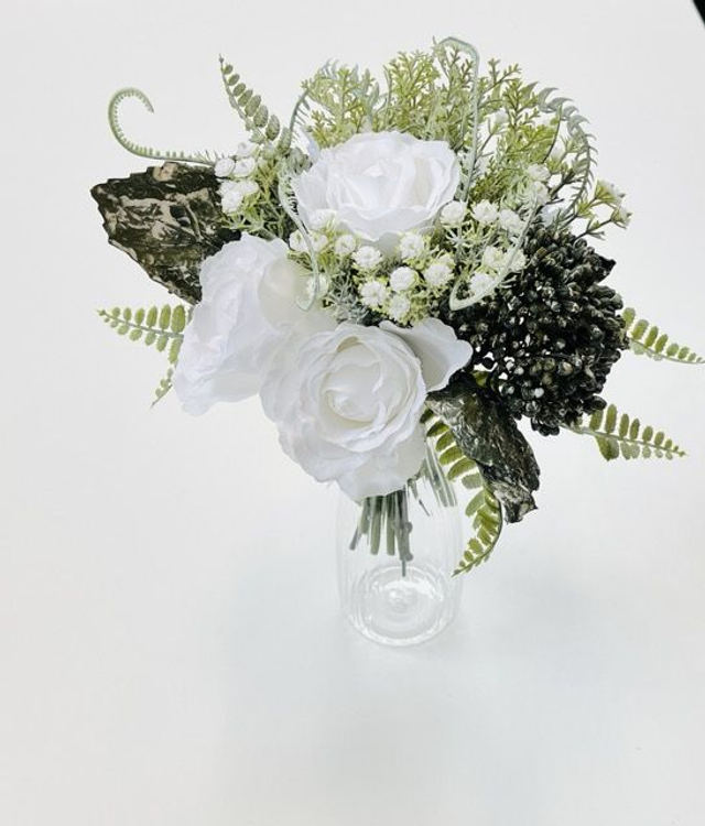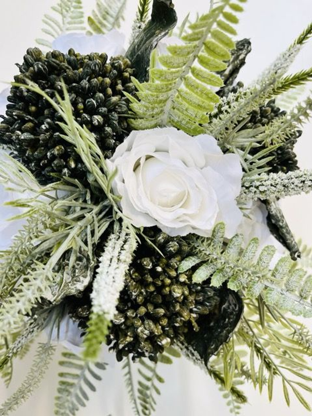 A striking woodland-inspired bouquet featuring white roses, lush green ferns, and clusters of berries, with a natural, rustic handle wrap — perfect for a forest or boho-themed wedding.