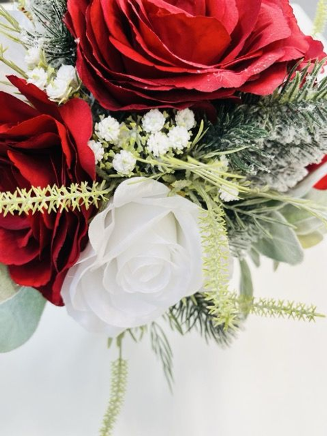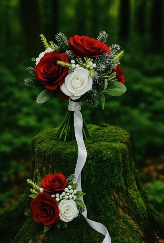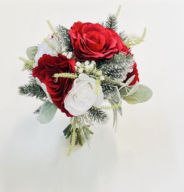 A classic and romantic bouquet featuring bold red and pure white roses, accented with soft greenery and tied with a flowing white ribbon — perfect for a timeless, elegant wedding